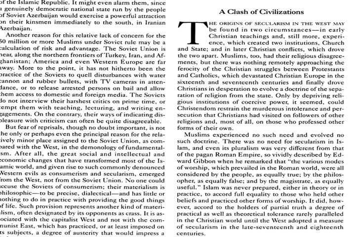 Samuel Huntington not only derived his thesis from that essay but actually borrowed the exact title—"A Clash of Civilizations”—from the heading Lewis chose for the section on the origins of secularism in Christianity (below).